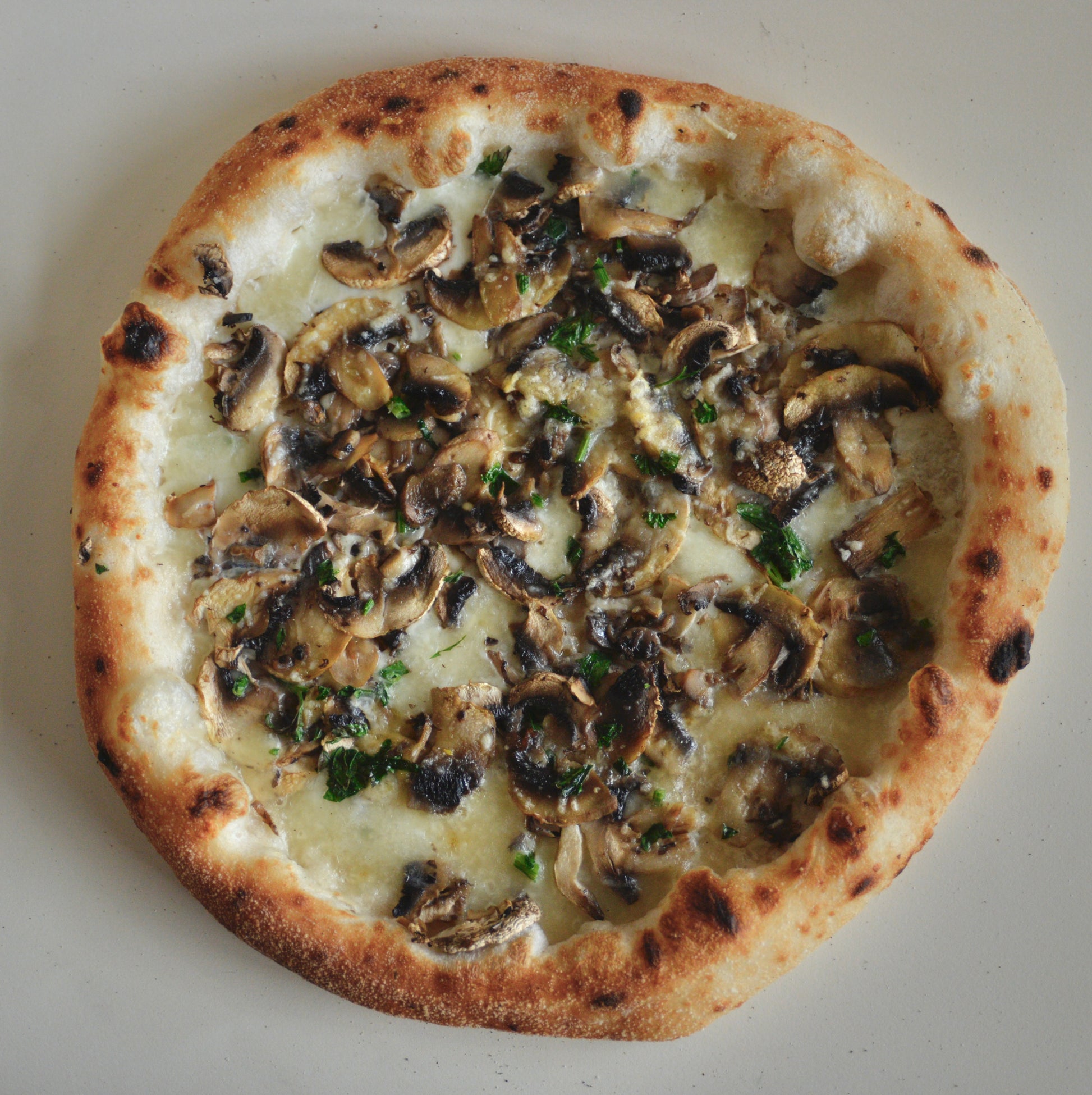 Pre-baked Garlic Mushroom Pizza made with Australian organic flour on a white pizza base, topped with garlic, mushroom, parsley, parmesan and La Delizia fior di latte mozzarella.